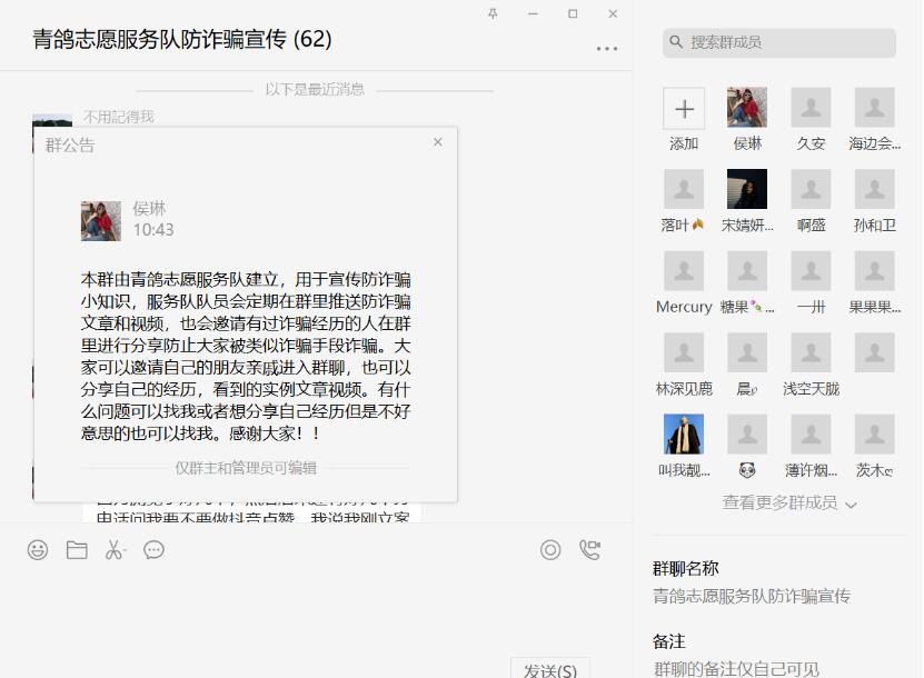 活动伊始,志愿者们通过组建防诈骗宣传微信群的方式,邀请学生们加入其中,定时向同学们推送典型的诈骗手段、犯罪案例与安全教育视频,带领大家共同学习,帮助同学们不断提高警惕意识与防诈骗能力。宣传群中,志愿者们围绕“网络电信诈骗”的主题,通过生动形象的短片向同学们普及电信诈骗的概念、新型电信网络诈骗的主要类型等内容,并邀请受骗者向同学们讲述真实的受骗经历。同时,志愿者们从身边的案例入手,向附近群众展示最近身边发生的多起电信诈骗事件,提醒人们提高防范意识,远离电信诈骗。志愿者们着重向人们介绍诈骗分子惯用诈骗手段,如刷单诈骗、冒充好友诈骗以及网络兼职诈骗等,帮助人们辨识和认清这些犯罪手段套路背后的真面目,从而减少网络诈骗事件的发生。